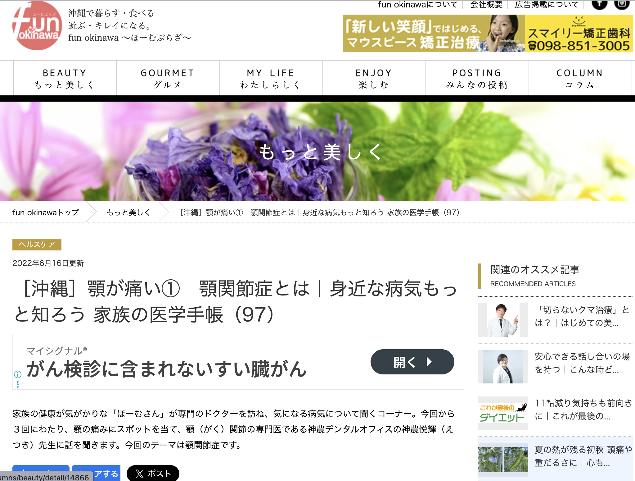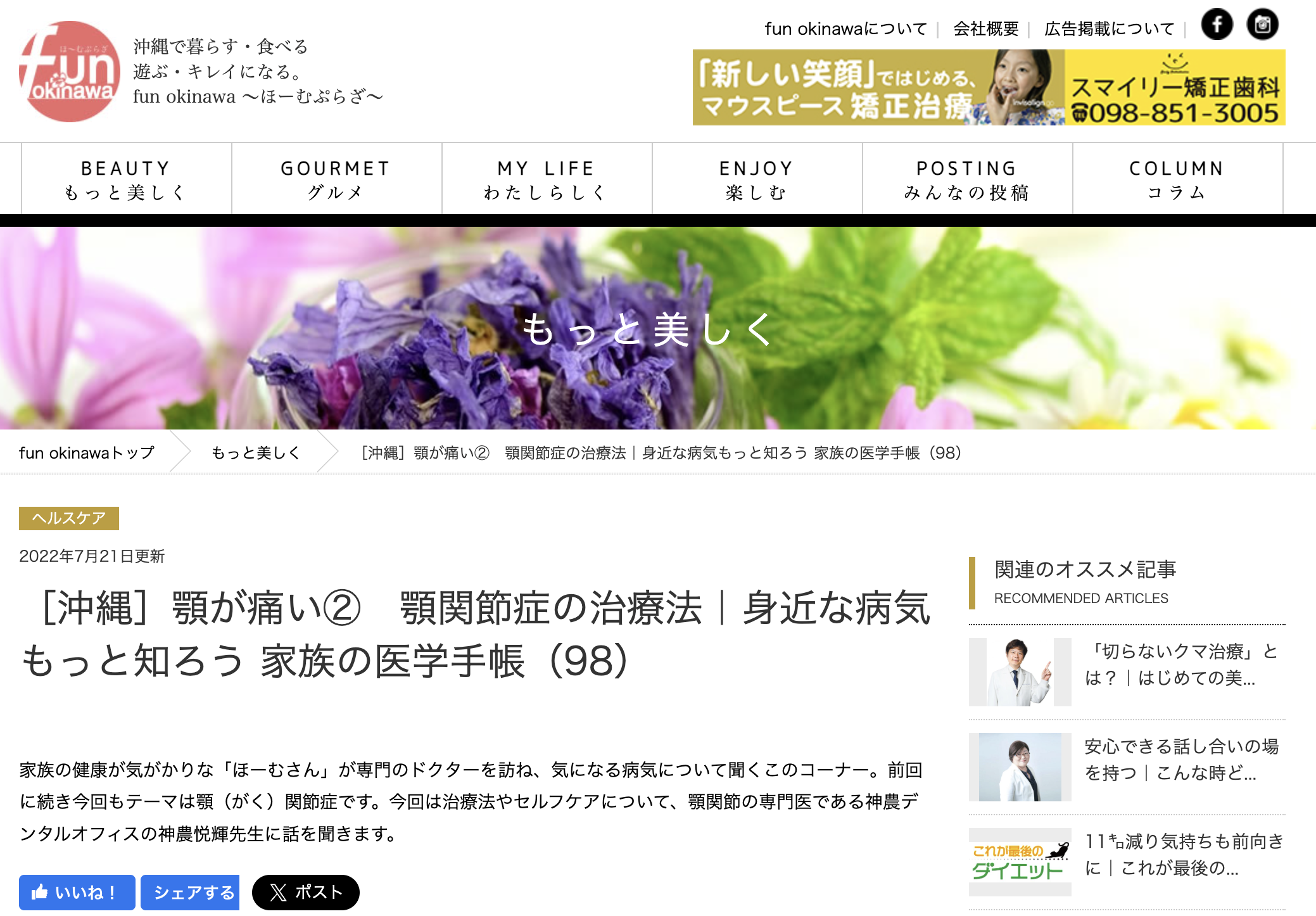 ウェブマガジン・fun okinawaに取材・掲載いただきました。 顎関節症に関して、2回に渡って取材・掲載いただきました。第一回は顎関節症について、第二回は治療法やセルフケアについてお話ししています。 [沖縄]顎が痛い① 顎関節症とは|身近な病気もっと知ろう 家族の医学手帳(97)[沖縄]顎が痛い② 顎関節症の治療法|身近な病気もっと知ろう 家族の医学手帳(98)